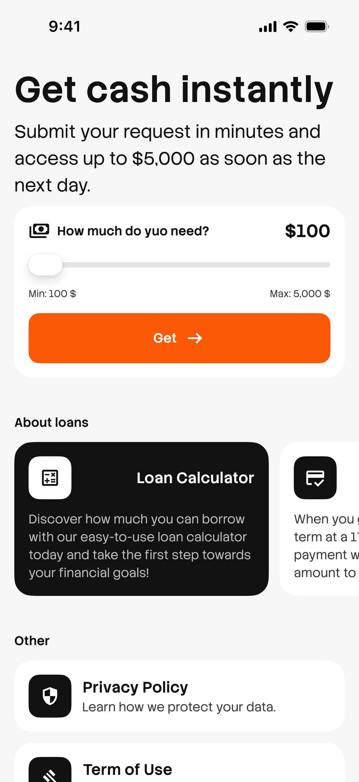 Use the interactive slider from $100 to $5,000 with live feedback, then tap Get to start matching.